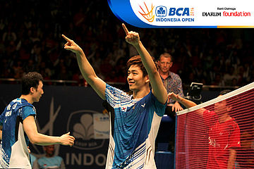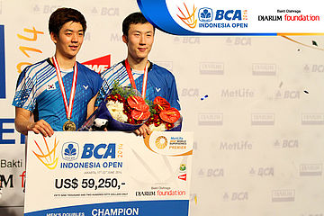 Selebrasi Lee Yong Dae/Yoo Yeon Seong (Korea Selatan) setelah berhasil memastikan diri sebagai juara ganda putra di BCA Indonesia Open Super Series Premiere 2014