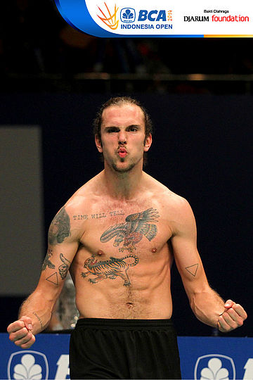 Kenichi Tago (jepang) bersiap menyambut pengembalian dari Jan O Jorgensen (Denmark)