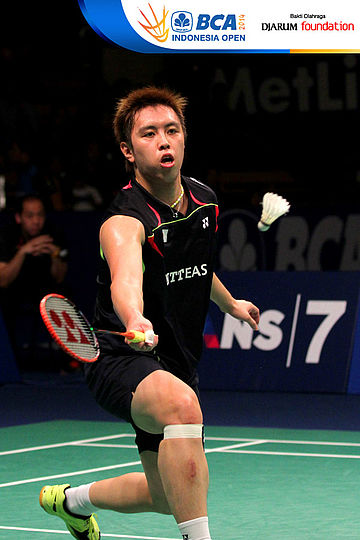 Kenichi Tago (jepang) bersiap menghadang serangan yang dilepaskan Jan O Jorgensen (Denmark)