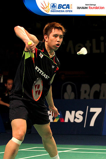 Kenichi Tago (jepang) mengembalikan shuttlecock ke arah Jan O Jorgensen (Denmark)