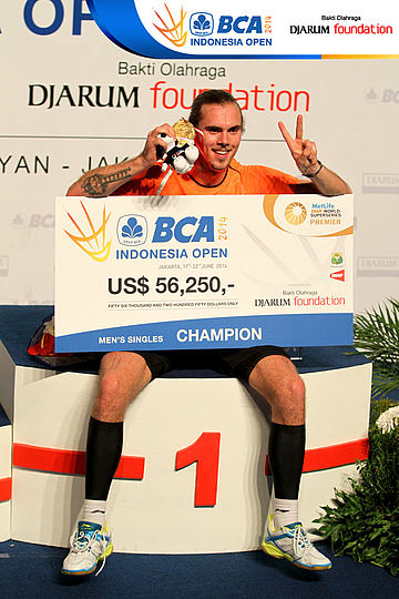 Jan O Jorgensen (Denmark) saat di podium juara BCA Indonesia Open Super Series Premiere 2014