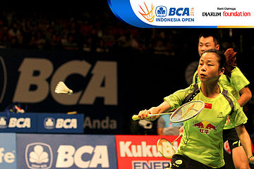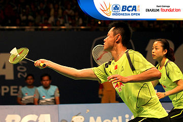 Xu Chen/Ma Jin (China) mengembalikan shuttlecock ke arah Joachim Fischer/Christinna Pedersen (Denmark)