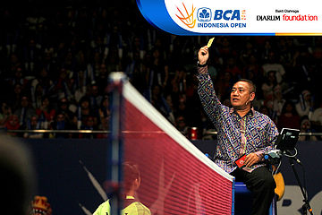 Umpire Eddy Rufianto (Indonesia) saat memberikan kartu kuning kepada pasangan China, Xu Chen/Ma Jin