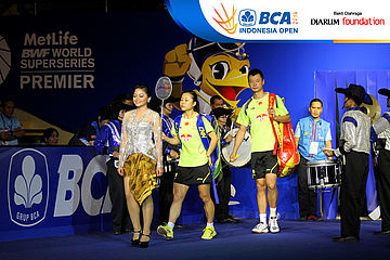 Joachim Fischer/Christinna Pedersen (Denmark) saat memasuki lapangan pertandingan