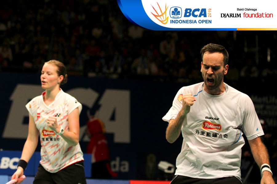 Ekspresi Joachim Fischer/Christinna Pedersen (Denmark) saat berhasil mencuri poin