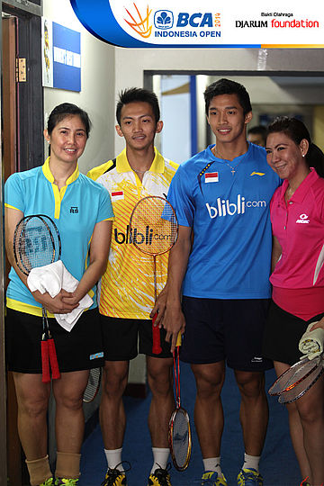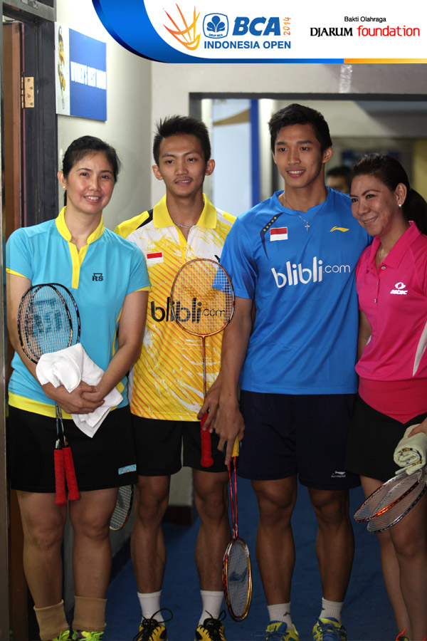 Sarwendah, Ihsan Maulana, Jonathan Christie dan Susi Susanti berpose sebelum eksibisi pada gelaran BCA Indonesia Open Super Series Premier 2014