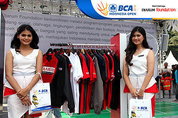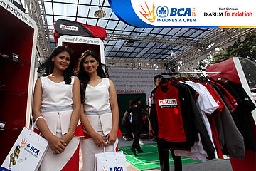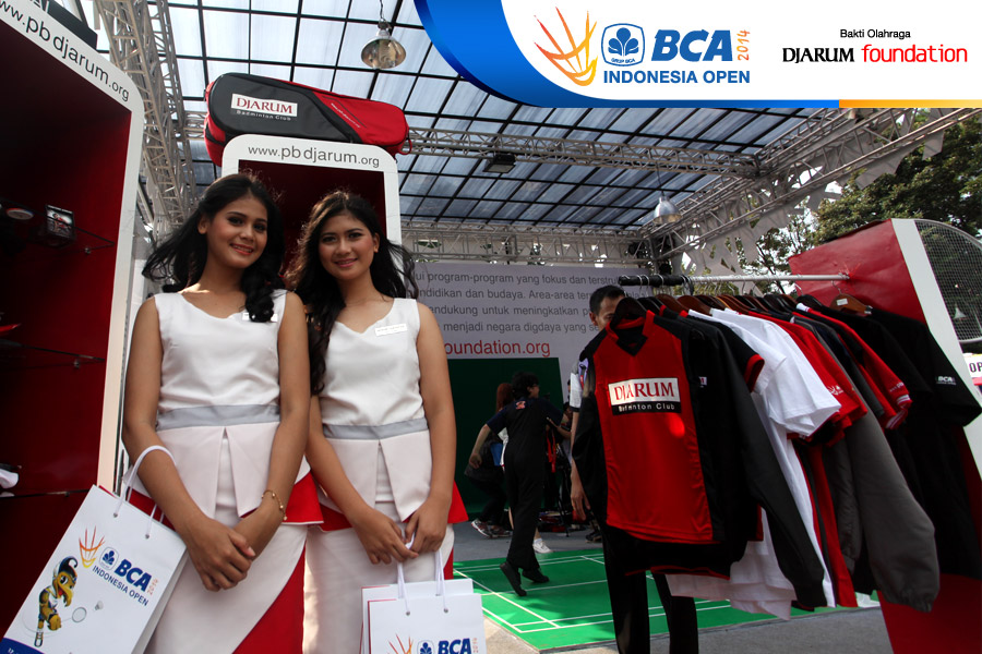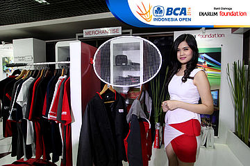 Seorang Usher berpose di booth PB Djarum Merchandise