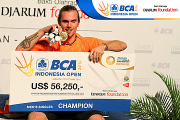 Jan O Jorgensen (Denmark) saat di podium juara BCA Indonesia Open Super Series Premiere 2014