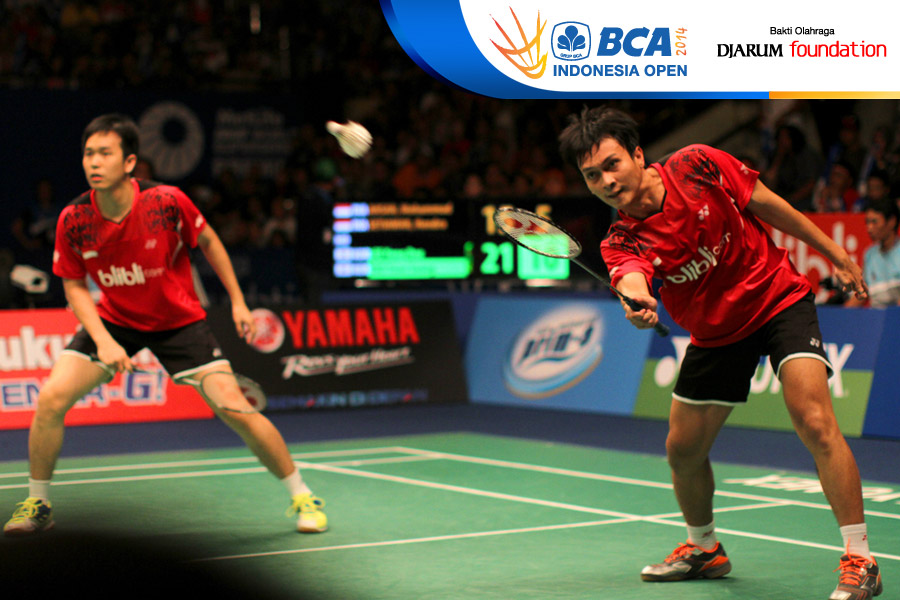 Lee Yong Dae/Yoo Yeon Seong (Korea Selatan) menghadang serangan yang dilepaskan Hendra Setiawan/Mohammad Ahsan (Indonesia)