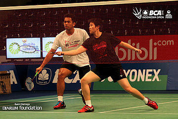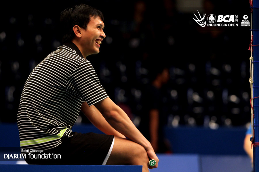 Mohammad Ahsan (Indonesia) terlihat gembira sebelum memulai latihan.
