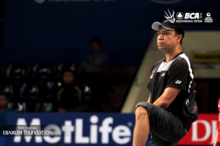 Pelatih ganda campuran Indonesia, Richard Mainaky saat memperhatikan anak asuhannya berlatih.