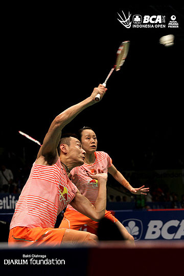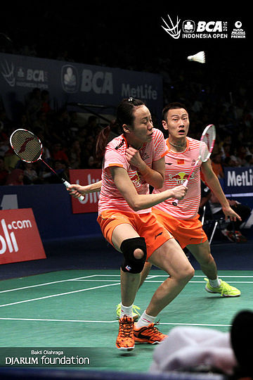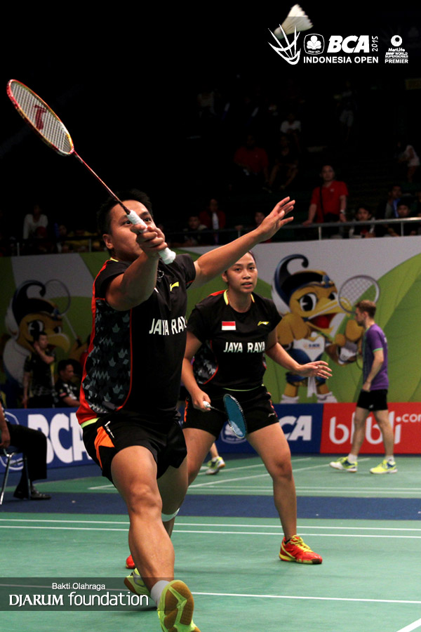 Tontowi Ahmad/Liliyana Natsir (Indonesia) mengembalikan shuttlecock ke arah Lee Chun Hei/Chau Hoi Wah (Korea Selatan).