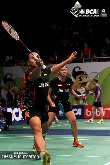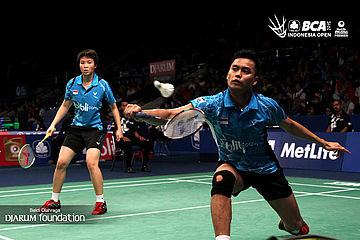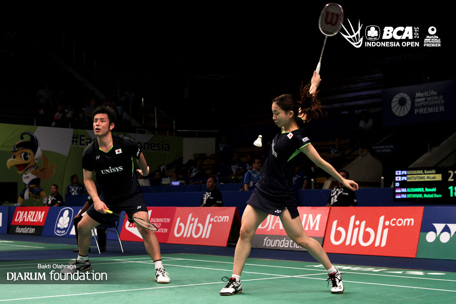 Kenichi Hayakawa/Misaki Matsutomo (Jepang) menyambut pengembalian dari Ronald Alexander/Melati Daeva (Indonesia).