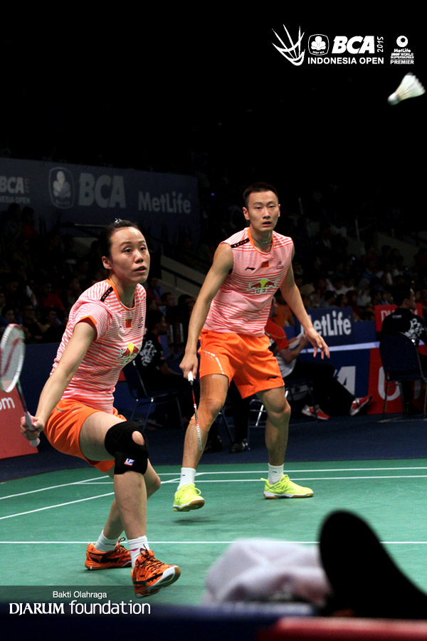 Zhang Nan/Zhao Yunlei (China) bersiap menyambut pengembalian dari Yoo Yeon Seong/Chang Ye Na (Korea Selatan).