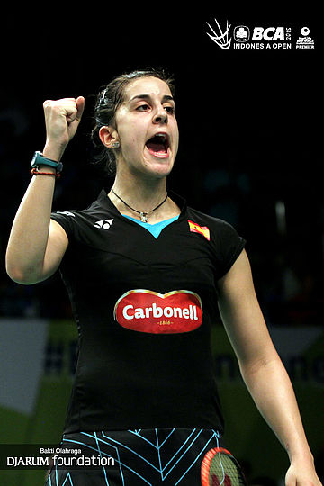 Ekspresi Carolina Marin (Spanyol) saat mencetak poin.