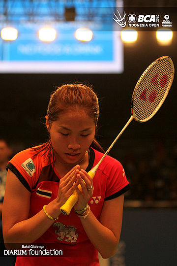 Ratchanok Intanon (Thailand) memberikan apresiasi kepada seluruh pengunjung Istora Senayan yang telah mendukungnya.