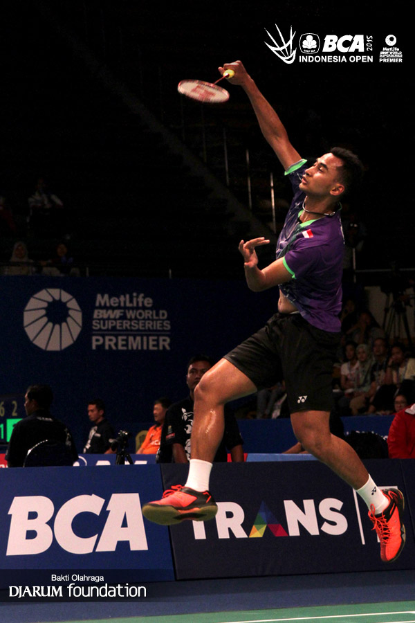 Tommy Sugiarto (Indonesia) mengembalikan shuttlecock ke arah Lin Dan (China).