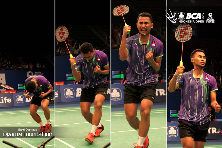Kolase selebrasi kemenangan Tommy Sugiarto (Indonesia) atas Lin Dan (China).
