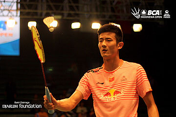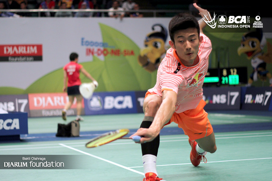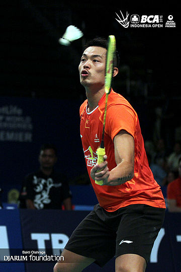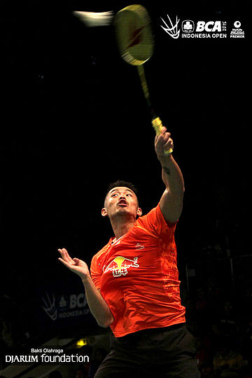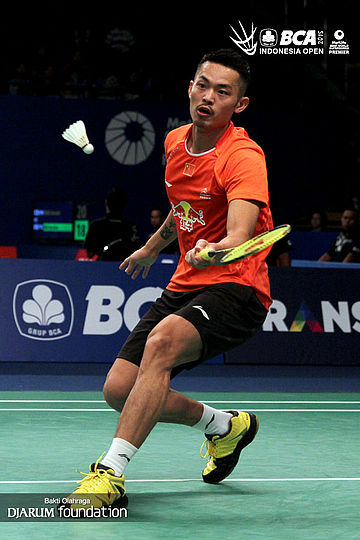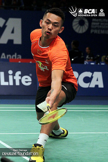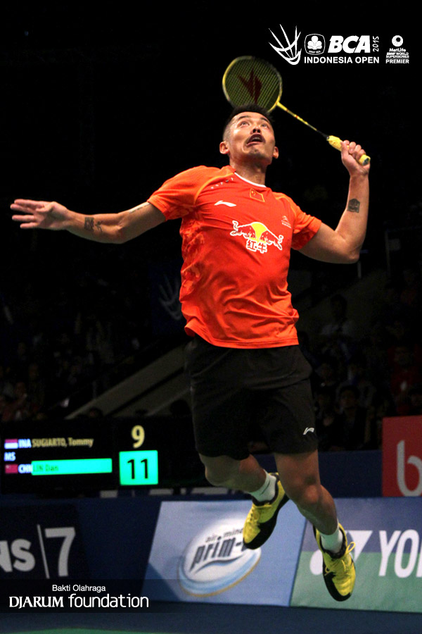 Lin Dan (China) menyambut pengembalian dari Tommy Sugiarto (Indonesia).