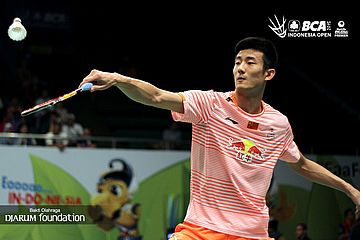 Lin Dan (China) mengembalikan shuttlecock ke arah Tommy Sugiarto (Indonesia).
