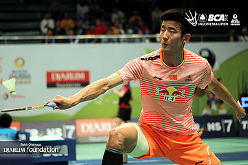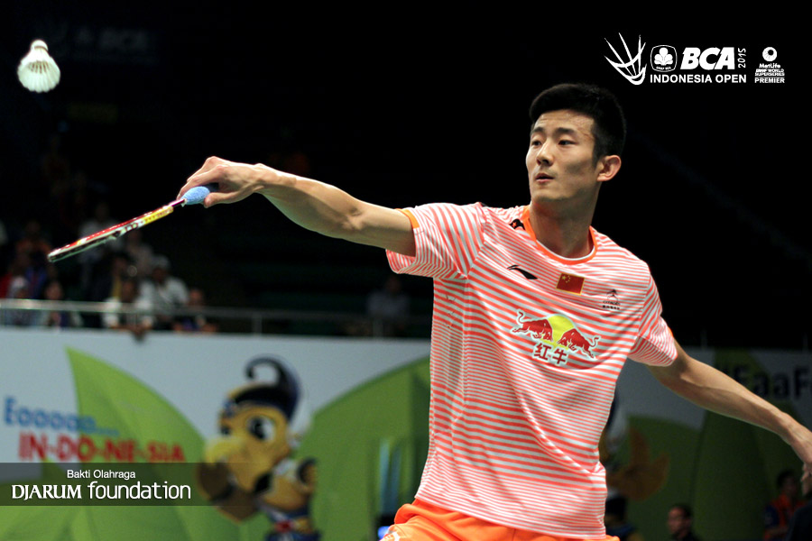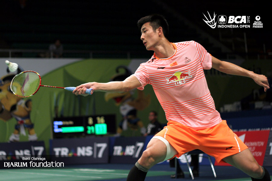 Chen Long (China) mengembalikan shuttlecock ke arah Wei Nan (Hongkong).