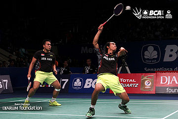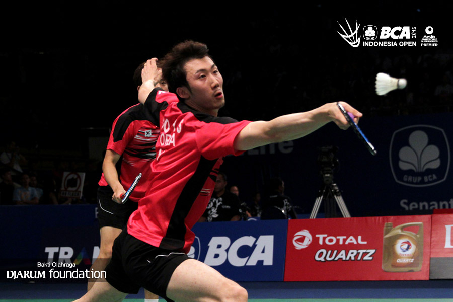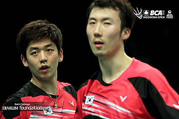Lee Yong Dae/Yoo Yeon Seong (Korea) mengembalikan shuttlecock ke arah Agripina Prima/Markis Kido (Indonesia).