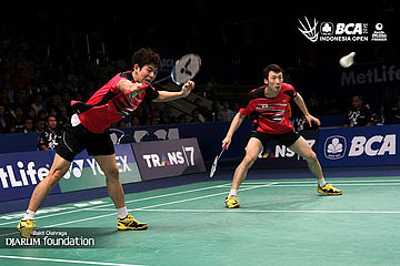 Agripina Prima/Markis Kido (Indonesia) mengembalikan shuttlecock ke arah Lee Yong Dae/Yoo Yeon Seong (Korea).