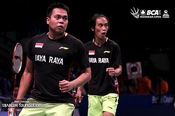 Ekspresi Agripina Prima/Markis Kido (Indonesia) saat berhasil mencuri poin.
