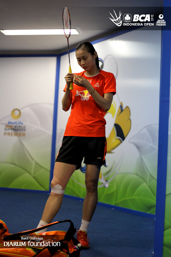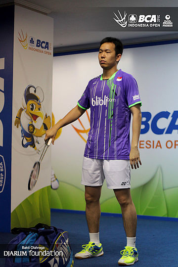 Hendra Setiawan (Indonesia) melakukan pemanasan sebelum bertanding.
