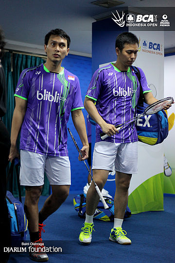 Mohammad Ahsan/Hendra Setiawan (Indonesia) bersiap memasuki arena pertandingan.