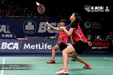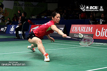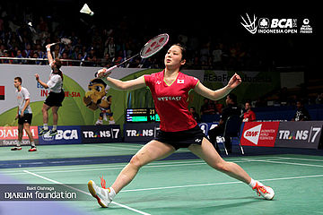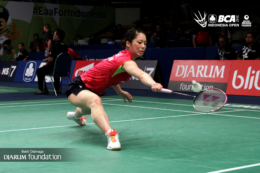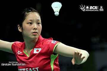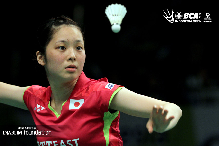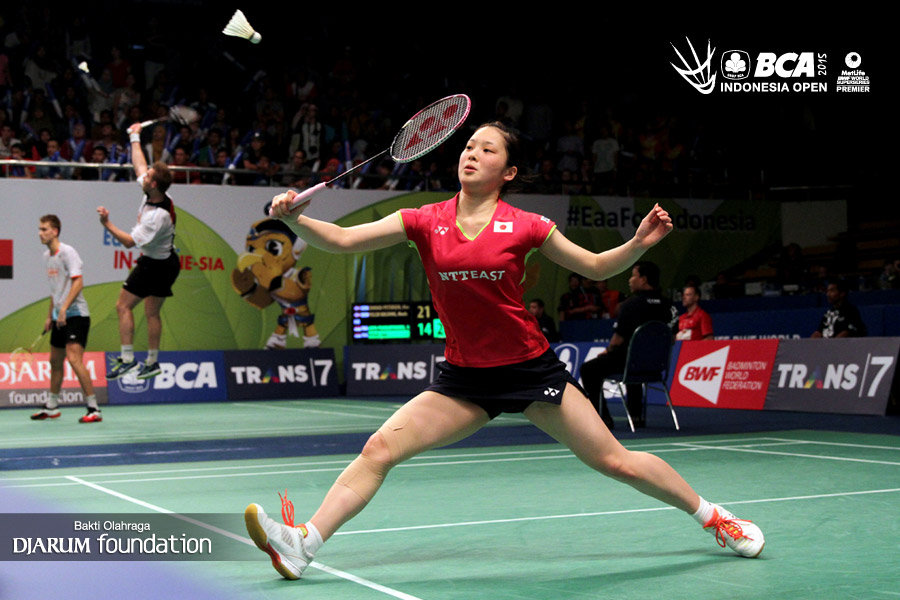 Minatsu Mitani (Jepang) mengembalikan shuttlecock ke arah Yui Hashimoto (Jepang).