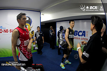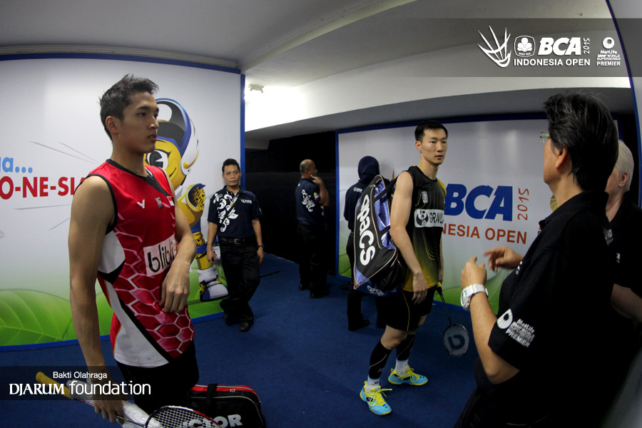 Jonatan Chistie (Indonesia) dan Lee Hyun Il (Korea) diberikan arahan oleh empire sebelum memasuki arena pertandingan.