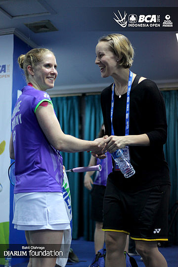 Karin Schnaase (Jerman) bercanda dengan temannya sebelum bertanding.