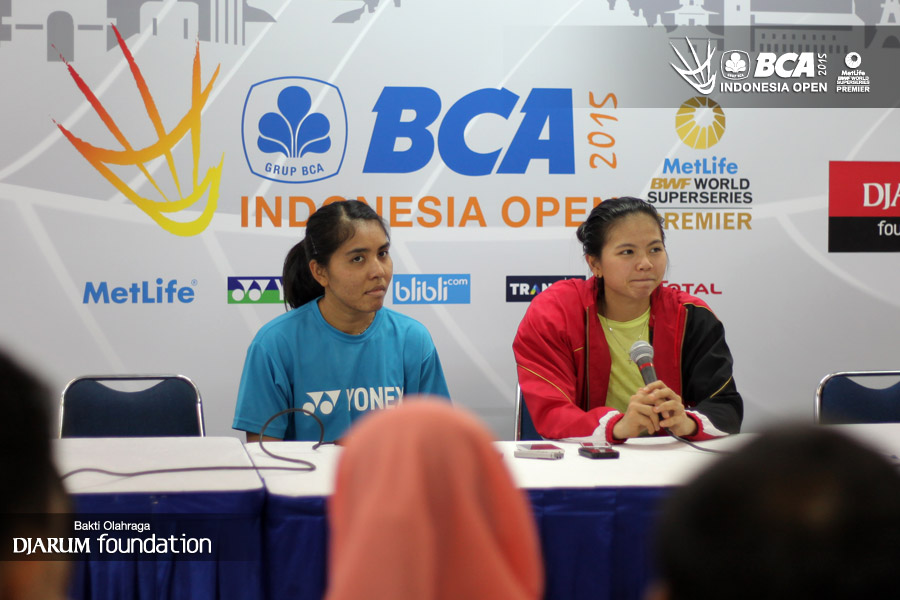Nitya Krishinda M/Greysia Polii (Indonesia) menjawab pertanyaan media.