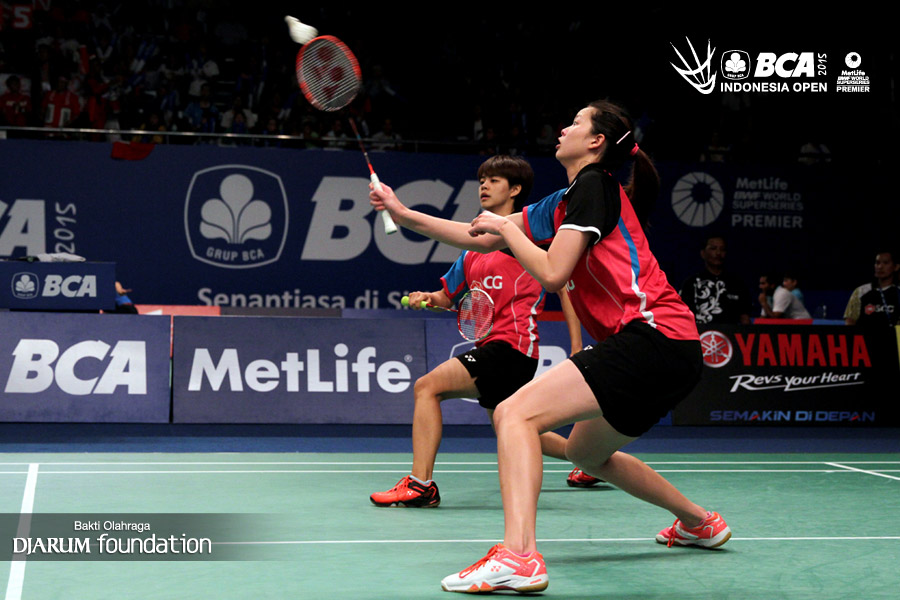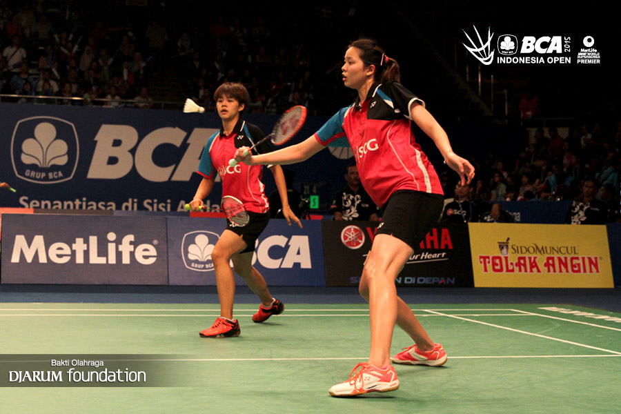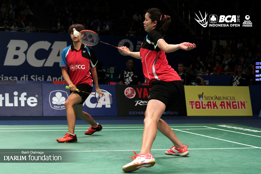 Puttita Supajirakul/Sapsiree Taerattanachai (Thailand) menghadang serangan yang dilepaskan Greysia Polii/Nitya Krishinda (Indonesia).