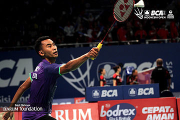 Tommy Sugiarto (Indonesia) mengembalikan shuttlecock ke arah Marc Zwiebler (Jerman).