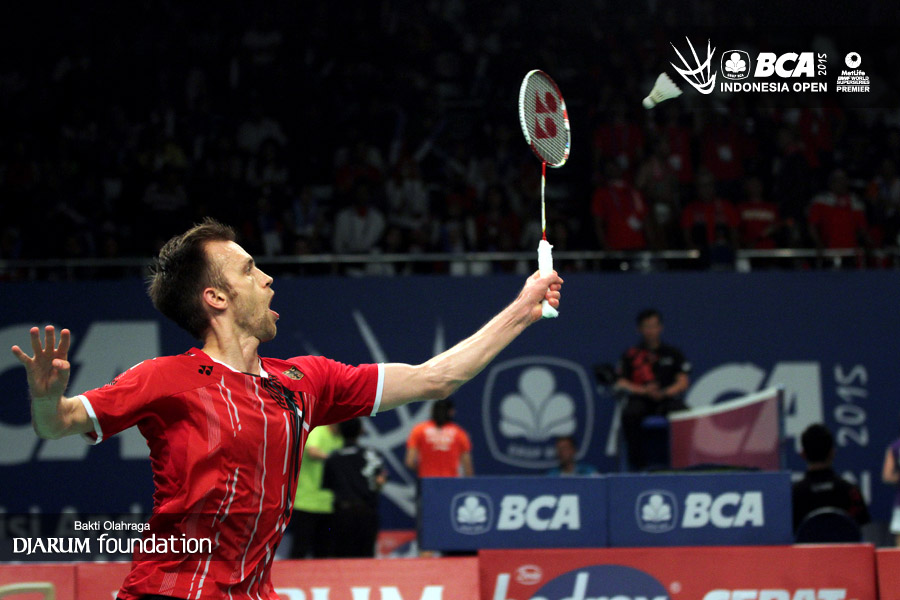 Marc Zwiebler (Jerman) mengembalikan shuttlecock ke arah Tommy Sugiarto (Indonesia).
