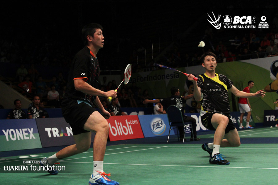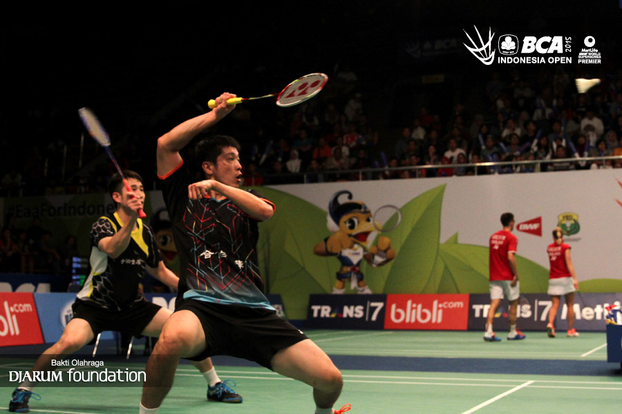 Lee Sheng Mu/Tsai Chia Hsin (China Taipei) mengembalikan shuttlecock ke arah Ko Sung Hyun/Shin Baek Choel (Korea).