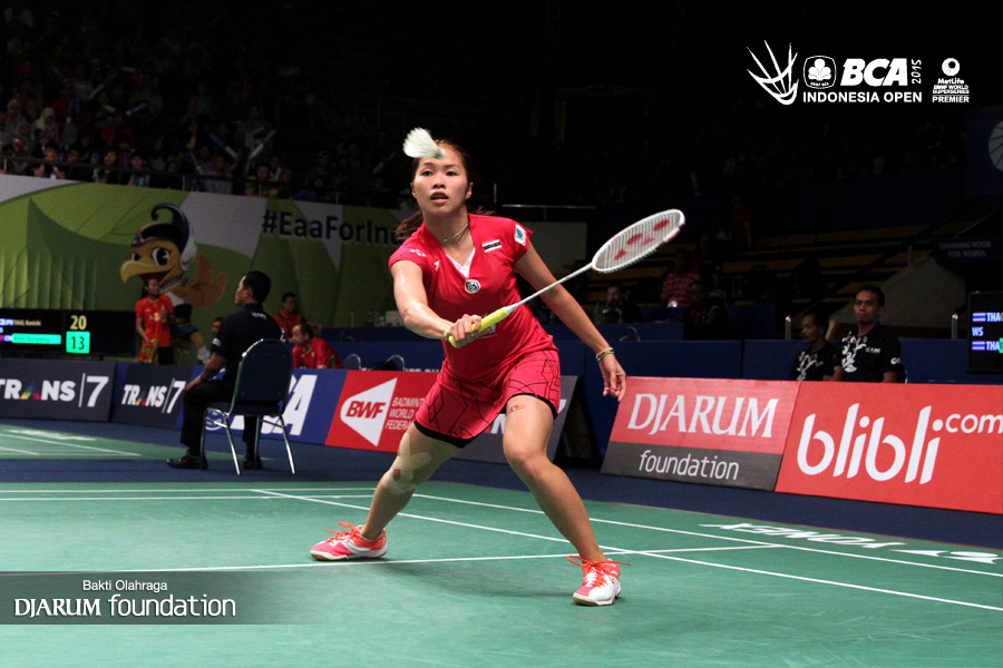 Ratchanok Intanon (Thailand) mengembalikan shuttlecock ke arah Busanan Ongbumrungpan (Thailand).
