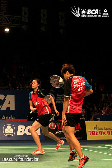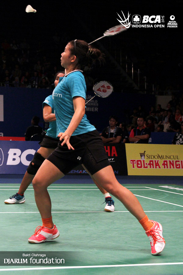 Puttita Supajirakul/Sapsiree Taerattanachai (Thailand) menghadang serangan yang dilepaskan Greysia Polii/Nitya Krishinda (Indonesia).