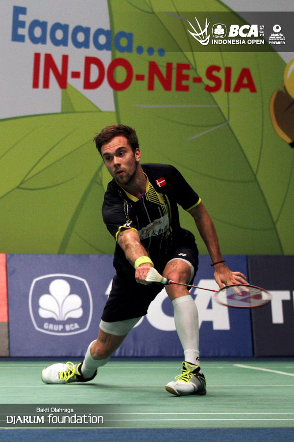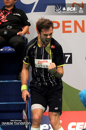 Ekspresi Jan O Jorgensen (Denmark) saat berhasil mencetak poin.
