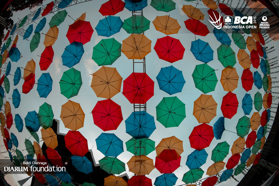 Puluhan ornament payung menghiasi gelaran BCA Indonesia Open Super Series Premier 2015.