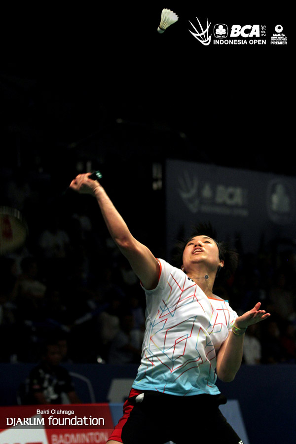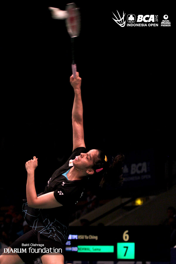 Saina Nehwal (India) melepaskan smash ke arah Hsu Ya Ching (China Taipei).