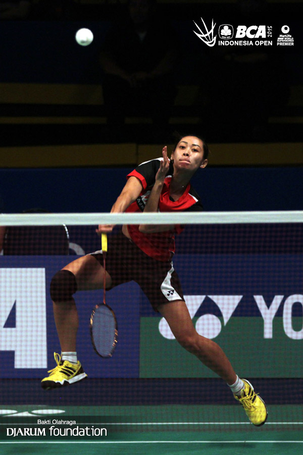 Maria Febe (Indonesia) melepaskan smash ke arah Yip Pui Yin (China Taipei).