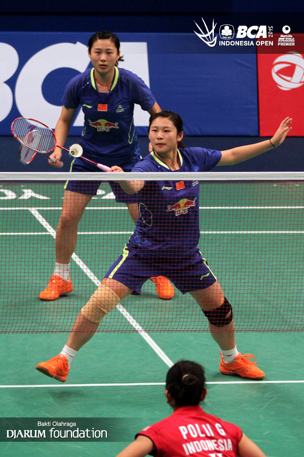 Luo Ying/Luo Yu (China) menyambut pengembalian dari Greysia Polii/Nitya Krishinda (Indonesia).