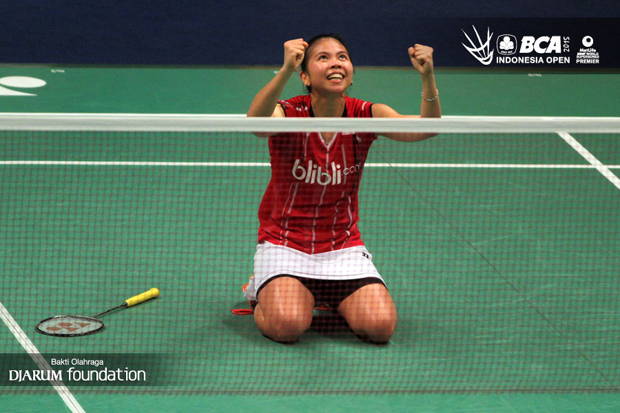 Selebrasi Greysia Polii (Indonesia) setelah berhasil mengalahkan Luo Ying/Luo Yu (China).