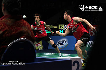 Ko Sung Hyun (Korea) bersiap menyambar pengembalian tanggung dari Lee Yong Dae/Yo Yoen Seong (Korea).