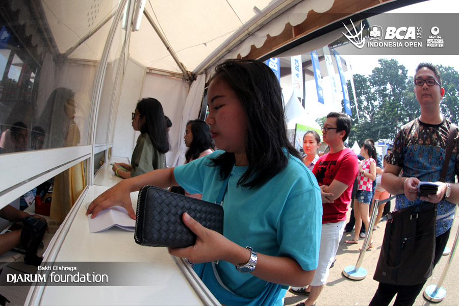 Beberapa pengunjung sedang memilih merchandise di booth PB Djarum.
