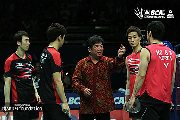 Lee Yong Dae/Yo Yoen Seong (Korea) bersiap menyambut pengembalian dari Ko Sung Hyun/Shin Baek Choel (Korea).