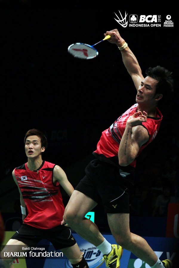 Ko Sung Hyun/Shin Baek Choel (Korea) melepaskan serangan ke arah Lee Yong Dae/Yo Yoen Seong (Korea).